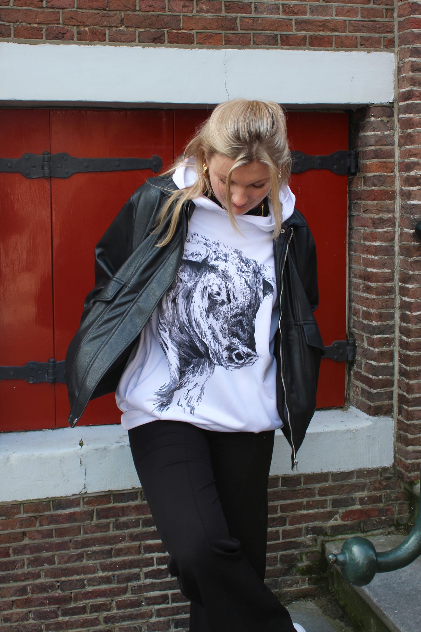 The Ram hoodie is locally produced in the Netherlands. Each hoodie features a unique production number on the hood, highlighting the small-scale local production process.
