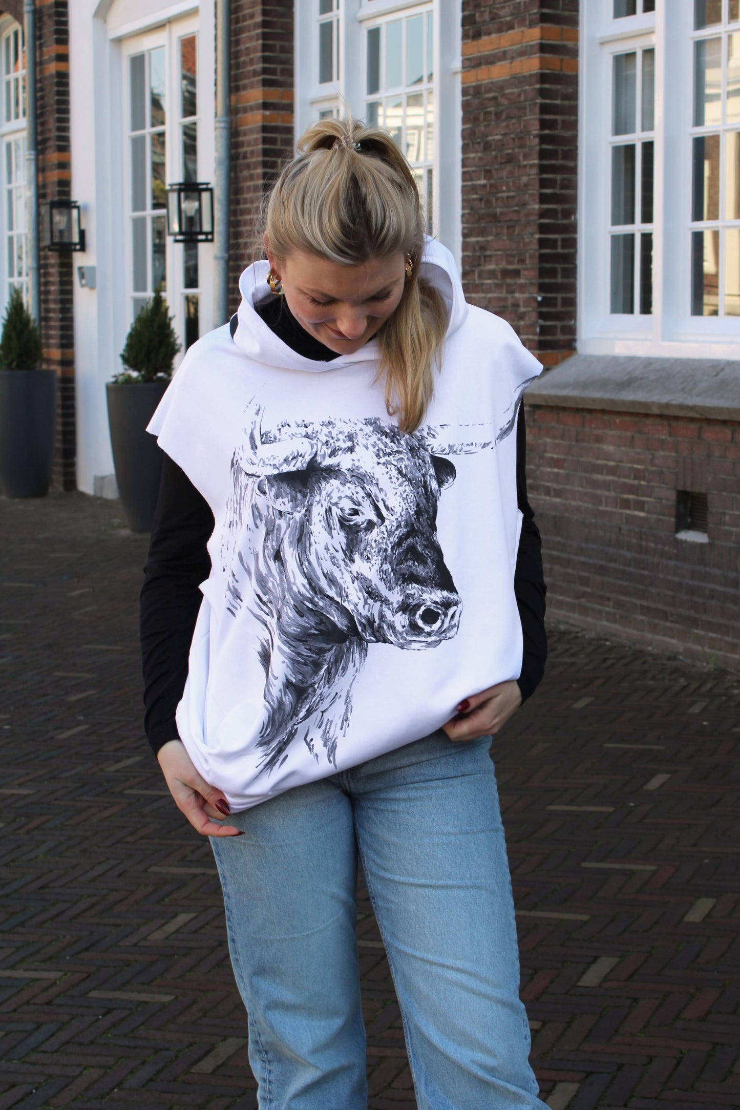 A modern sleeveless hoodie featuring a gigantic black-and-white Bull's head on the front.